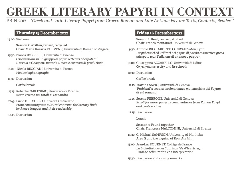 Segnaliamo per i prossimi 15 e 16 dicembre a Genova il convegno "Greek Literary Papyri in Context" nell'ambito del progetto “Greek and Latin Literary Papyri from Graeco-Roman and Late Antique Fayum: Texts, Contexts, Readers" (PRIN 2017).