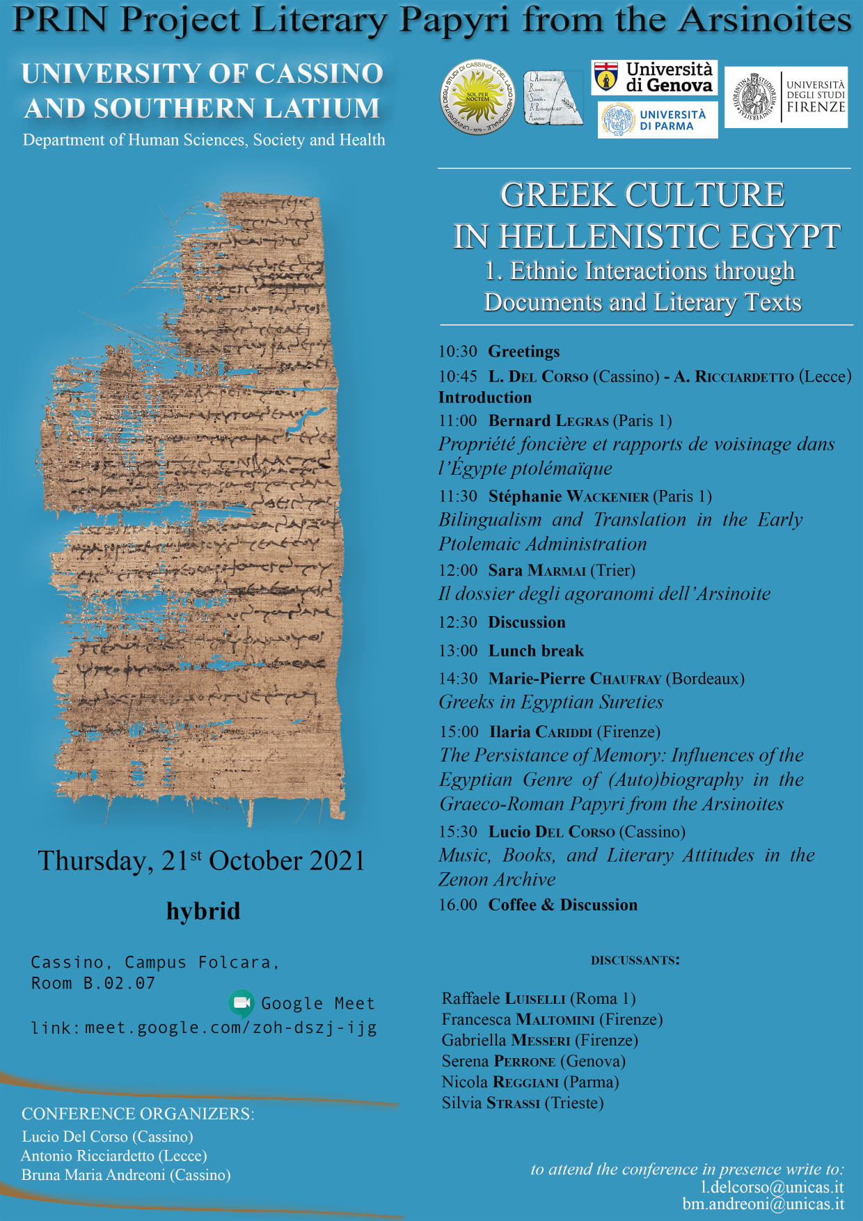 giornata di studi, PRIN Project Literary Papyri from the Arsinoites.
