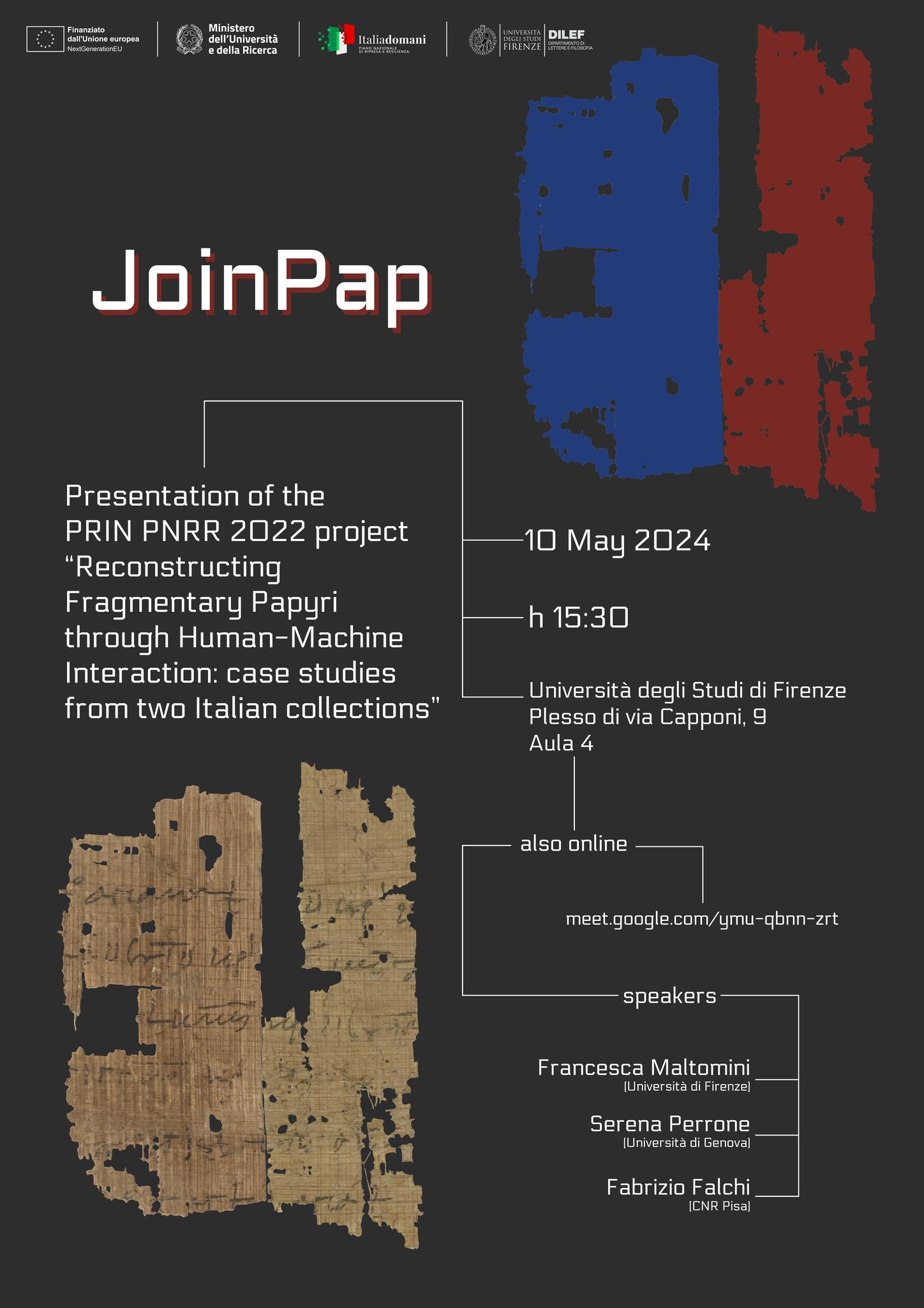 Workshop, PRIN PNRR 2022 “Reconstructing Fragmentary Papyri through Human-Machine Interaction: case studies from two Italian collections”